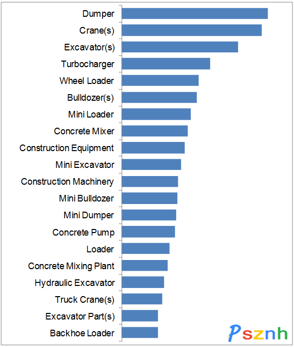 2016年1-3月工程機械行業最熱門的搜索關鍵詞為Dumper,其次為Crane(s)和Excavator(s)。