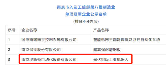 近日,埃斯頓“光伏排版工業機器人”入選工信部第八批制造業單項冠軍企業名單,這是埃斯頓繼獲得國家級專精特新“小巨人”稱號之后的又一殊榮。聚焦光伏全產業鏈應用工藝,埃斯頓深耕細作、圍繞硅晶、電池片、光伏組件各工藝段智能制造需求,打造光伏行業智能化完整解決方案。