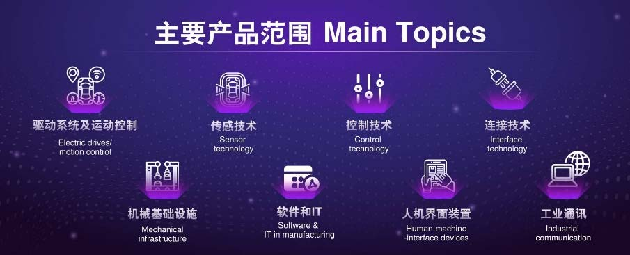 ? 展品范圍 ● 驅動系統及零部件 Drive systems and components ● 傳感技術 Sensor technology ● 控制技術 Control technology ● 工廠電網和電源 Factory power - grids and -supplies ● 連接與連接技術 Interface and interface technology ● 低電壓開關裝置 Low voltage-switching devices● 機械基礎設施 Mechanical infrastructure ● 工業用計算機設備 IPCs ● 軟件和 IT Software & IT in manufacturing ● 人機界面 Human-Machine-Interface ● 工業通訊 Industrial communication ● 培訓及咨詢 Training and consulting ● 工業機器人 Robotization