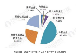 儀器儀表行業增速穩定的另一面,是國內外市場爭奪進入白熱化階段,競爭較為激烈。截至2017年3月,我國規模以上儀器儀表制造企業有4311家。私營企業數量占比達到45.96%;外商及港澳臺投資數量占比24.68%;股份制企業數量占比為4.19%;國有企業數量占比2.28%;股份合作企業和集體企業數量占比分別為1.16%和0.70%。