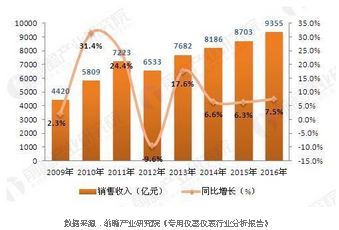 總體來看,近年來我國儀器儀表行業市場規模實現了快速擴張,銷售收入已由2009年的4420億元增至2016年的9355億元。2013年以來,我國儀器儀表行業產品銷售明顯回暖,增速趨于穩定。2016年,我國儀器儀表行業銷售增速為7.5%。