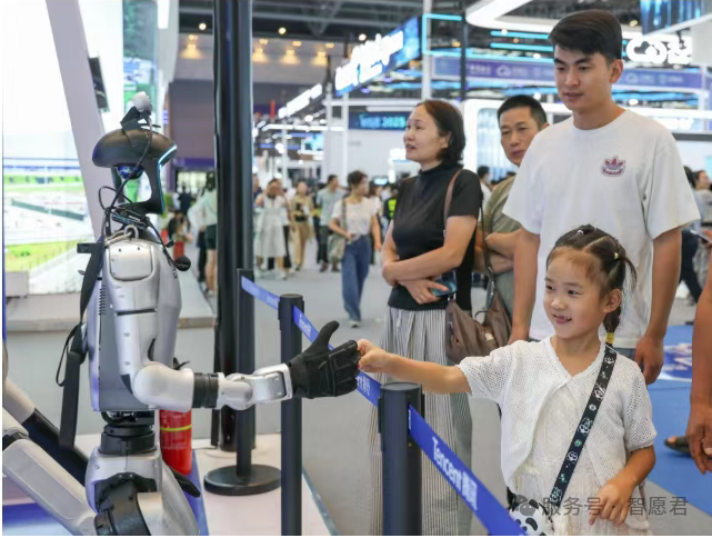 圖:2025年世界智能產(chǎn)業(yè)博覽會上,一臺人形機器人與小朋友握手(新華社)