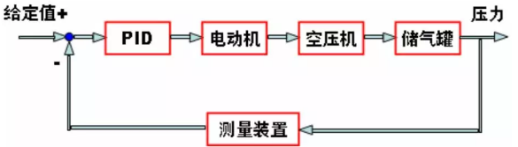 通過壓力變送器測得的管網壓力值與壓力的設定值相比較,得到偏差,經PID調節器計算出節電器作用于異步電動機的頻率值。由節電器輸出的相應頻率和幅值的交流電,使電動機上得到相應的轉速。那么空壓機輸出相應的壓縮空氣至儲氣罐,使之壓力變化,直到管網壓力與給定壓力值相同。