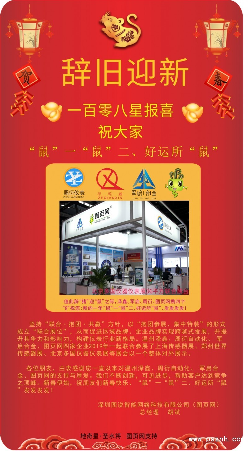 各位朋友,由衷感謝您一直以來對溫州澤鑫、周衍自動化、 軍啟合金、圖頁網的支持與厚愛。我們不斷創新,可見進步,幫助客戶達到競爭之頂峰。新春伊始,祝朋友們新春快樂、“鼠”一“鼠”二、好運所“鼠 ”發發發發!