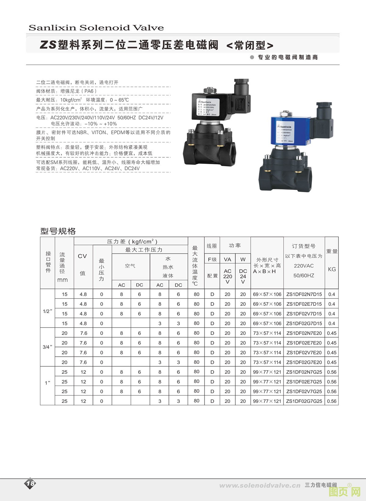 ZS塑料系列二位二通零差壓電磁閥/常閉型