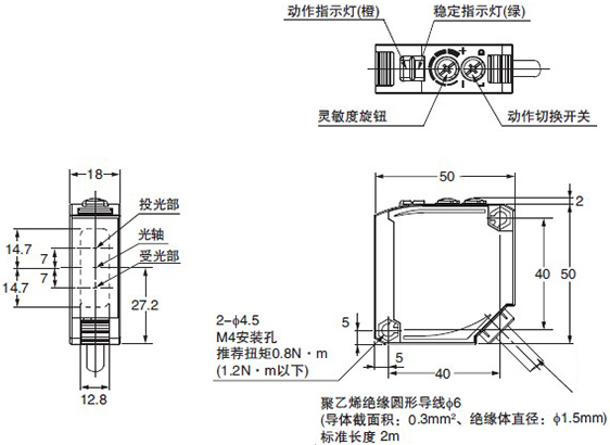 輸出 | NPN/PNP 繼電器輸出:1c觸點(diǎn) AC250V 3A(cosφ=1)以下, DC5V 10mA以上 入光時on/遮光時on 開關(guān)切換 | |